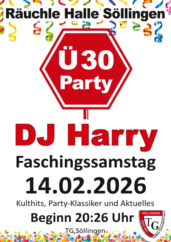 Die TG Söllingen lädt herzlich zur beliebten Ü30 Party in die Räuchle Halle Söllingen ein. Freuen Sie sich auf eine ausgelassene Faschingsnacht voller Musik, Tanz und guter Laune!