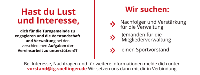 Bei Interesse, Nachfragen und für weitere Informationen melde dich unter vorstand@tg-soellingen.de Wir setzen uns dann mit dir in Verbindung.